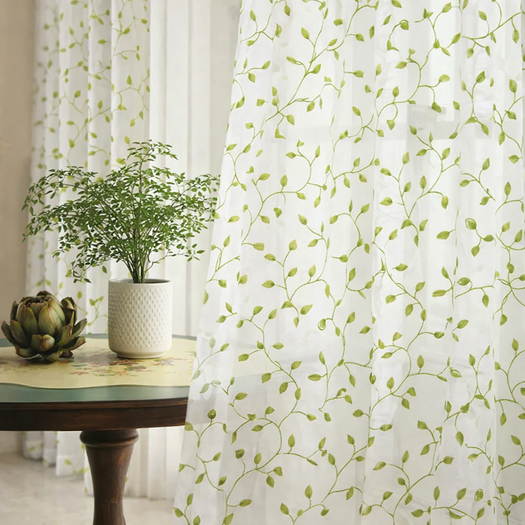 Zeva – Geborduurde Bladeren Semi-transparante Gordijnen met Oogjes, Groen/Wit