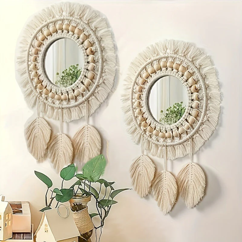 De Boho Chic handgeweven rattan wandspiegels met bladkwastjes geven elke ruimte een natuurlijke en stijlvolle uitstraling. Deze unieke spiegels zijn perfect voor elke kamer in uw huis, of het nu de slaapkamer, woonkamer of badkamer is. Het frameloze ontwerp en de gepolijste afwerking zorgen voor een moderne en strakke look, terwijl de bladkwastjes een bohemian touch toevoegen. Hang ze gemakkelijk op met de muurbevestiging en geniet van een opvallende decoratie die direct opvalt.