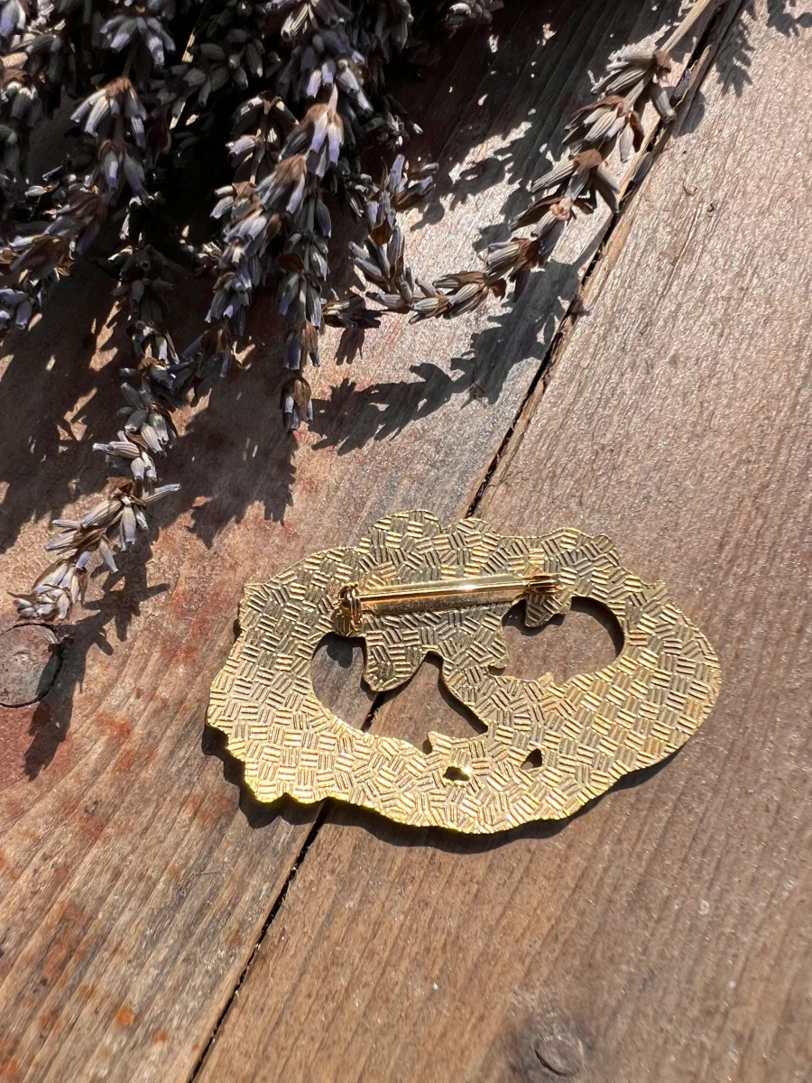 Het goudkleurige metalen frame vormt een mooi contrast met de groene emaille en accentueert de Art Nouveau esthetiek. De broche heeft een klassieke veiligheidsspeld aan de achterkant, waardoor deze gemakkelijk op kleding kan worden bevestigd.