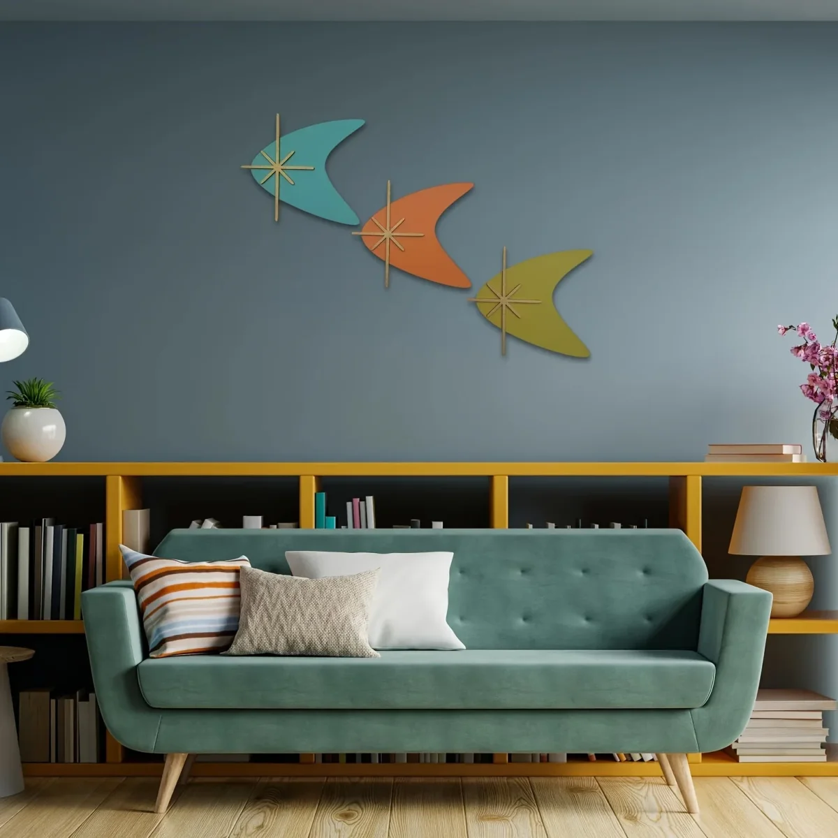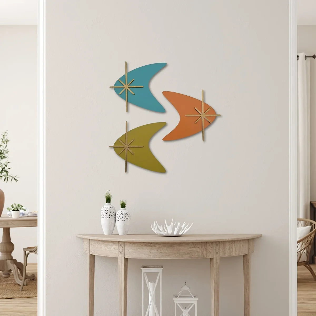 Breng een vleugje vintage elegantie in je woonkamer met deze 3-delige set Art Deco Metalen Muursculpturen. Het geometrische boemerangontwerp en het abstracte thema creëren een opvallende visuele impact, perfect voor Thanksgiving en andere feestelijke gelegenheden. Gemaakt van hoogwaardig metaal en ontworpen als reproductie, voegen deze sculpturen een verfijnd en stijlvol accent toe aan je interieur.
