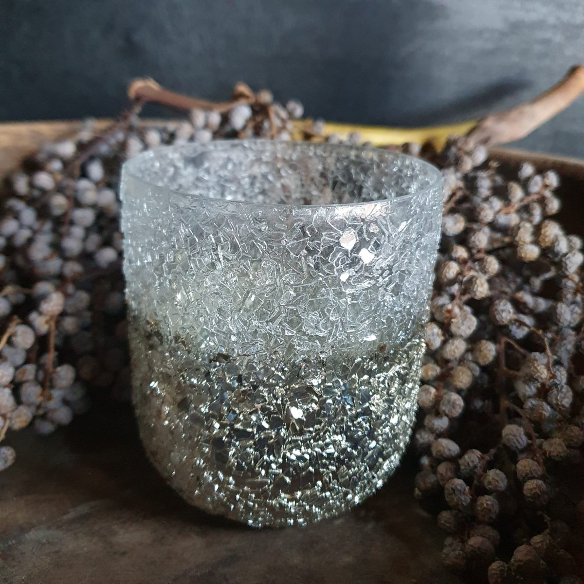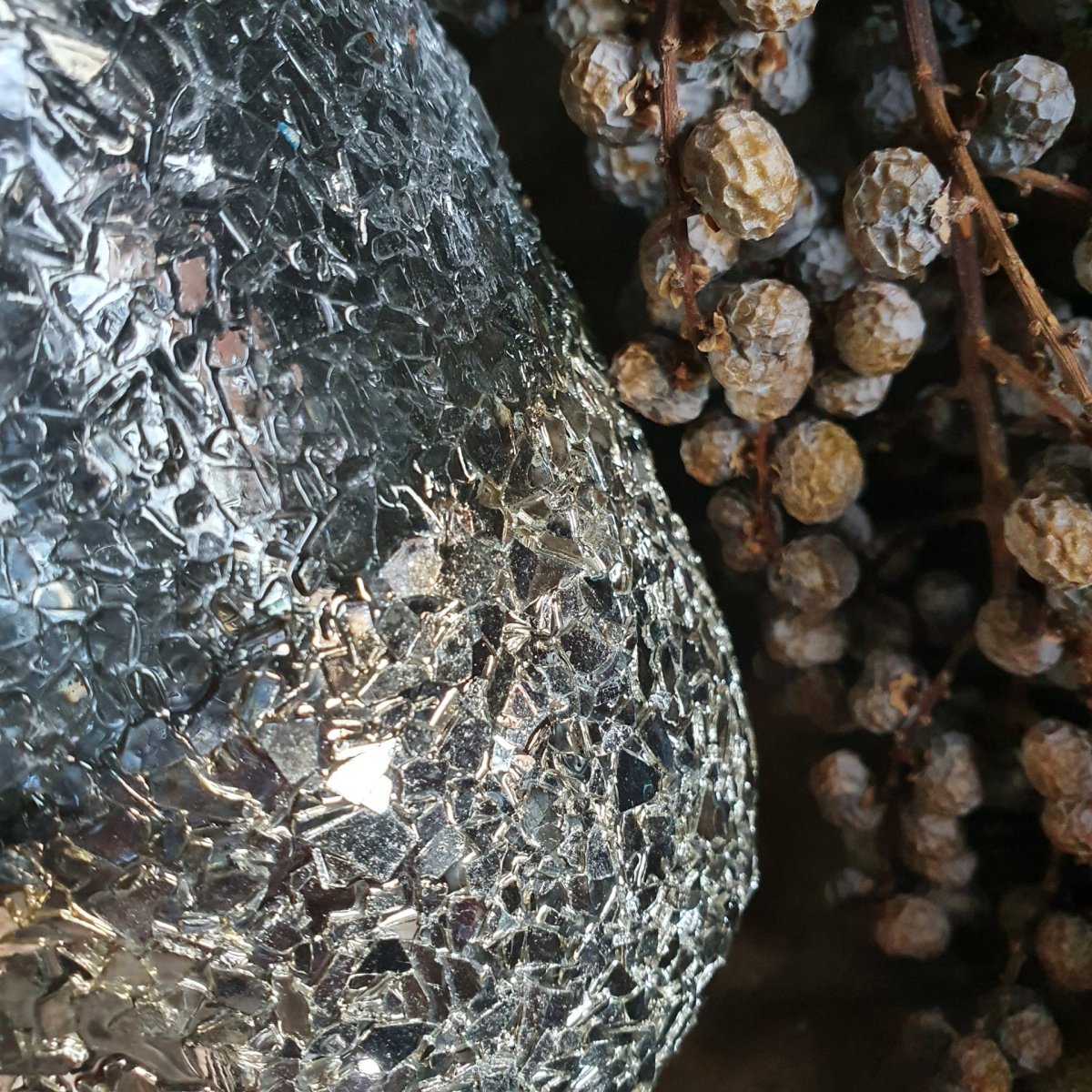De buitenkant lijkt op gebroken glas, net allemaal splinters. Van boven ‘doorzichtig’, van onderen goudkleurig. Heel sfeervol!