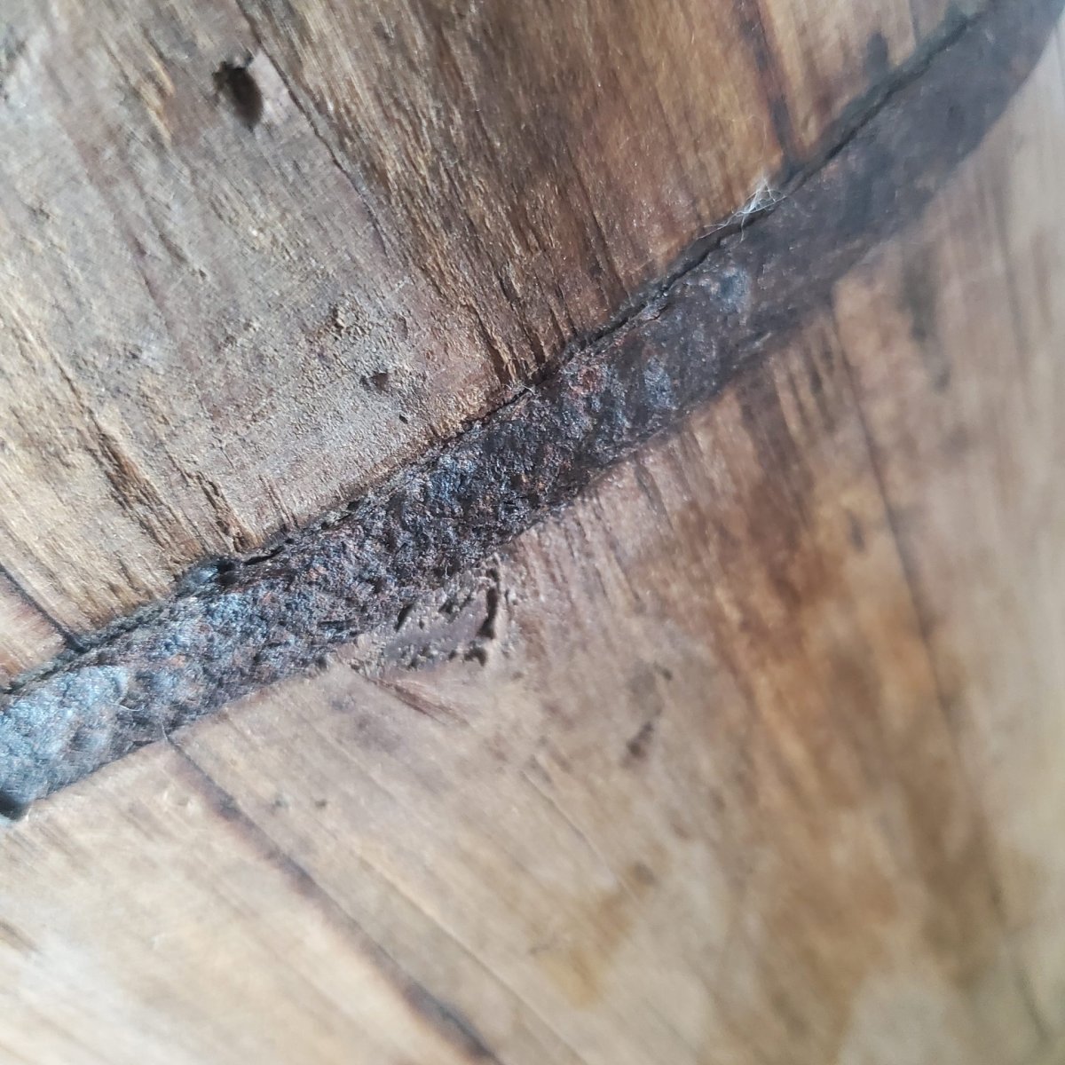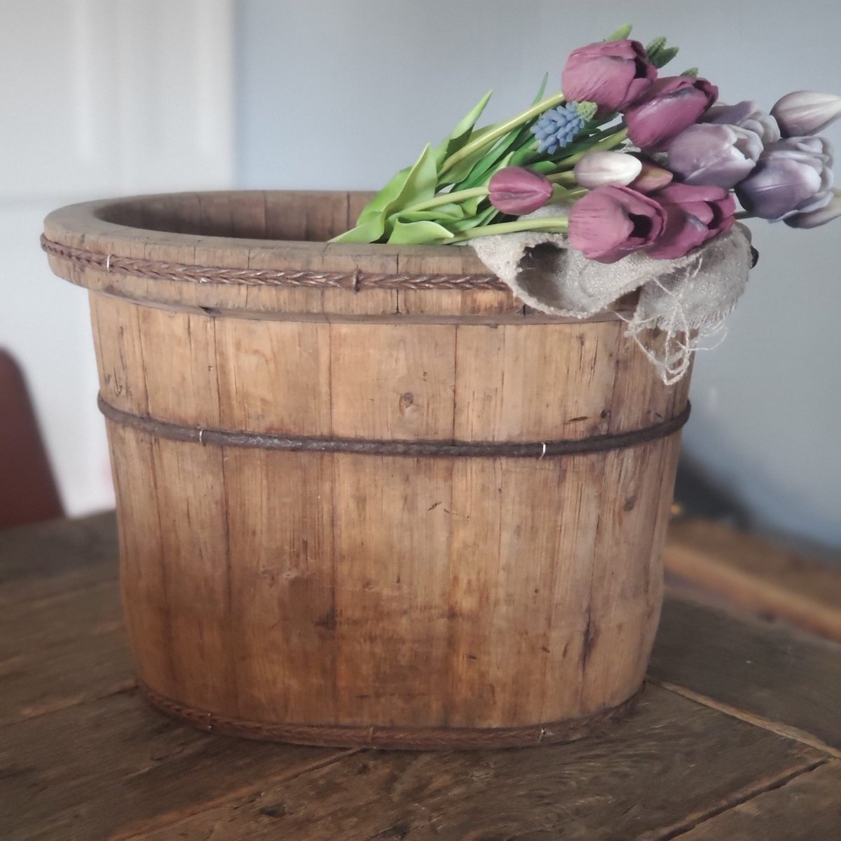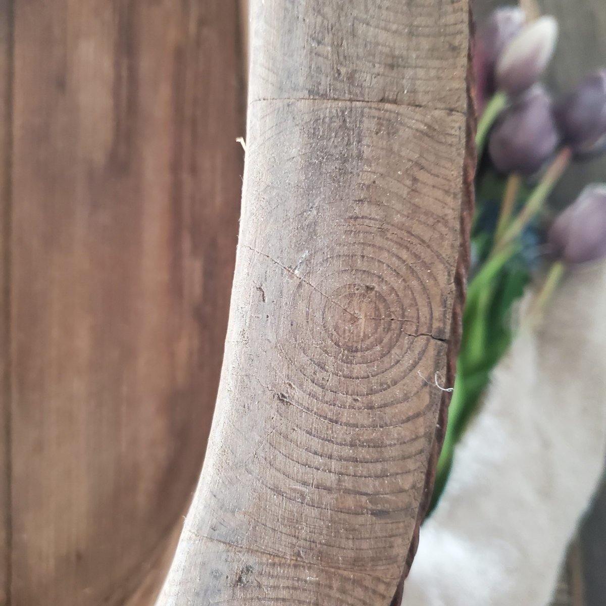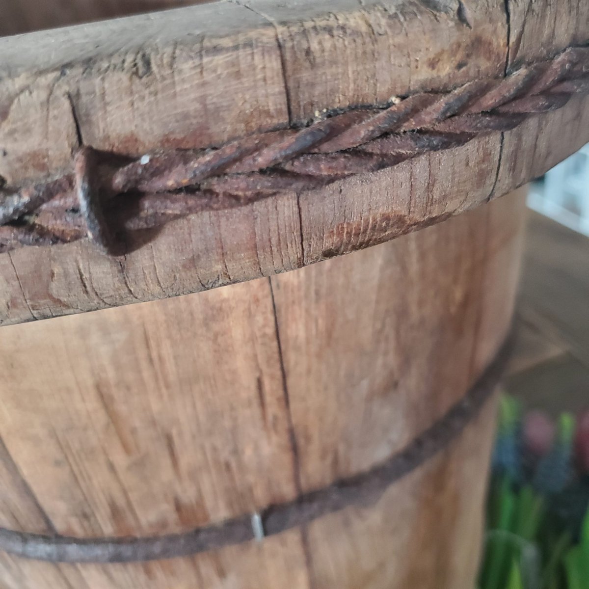 Met mooie details zoals bovenaan de in het hout gekerfde versiering en de gevlochten, ijzeren band bovenaan en in het midden een stoere roestige ijzeren band.