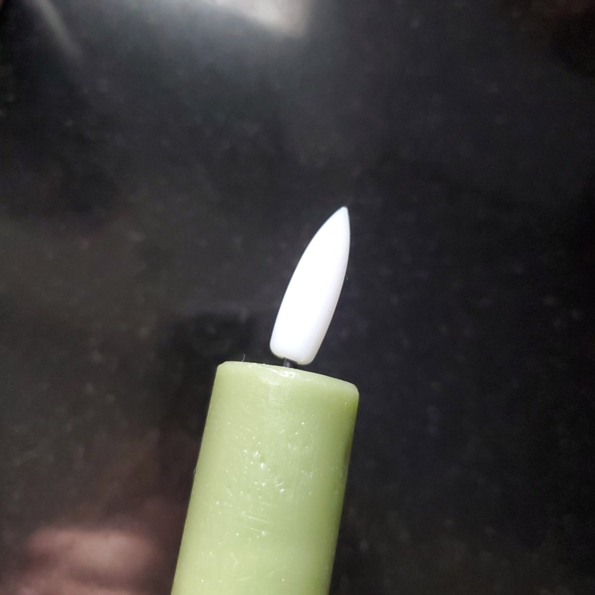 Het olijfgroene kaarsje ziet er bijna uit als een ‘echt’ kaarsje, enkel het vlammetje is van plastic maar zodra dat brandt zie je bijna geen verschil meer!