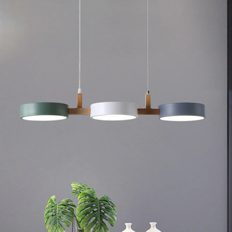 Moderne Houten Arm Hanglamp met Meerkleurige Cilinders, 3 LED Koppen