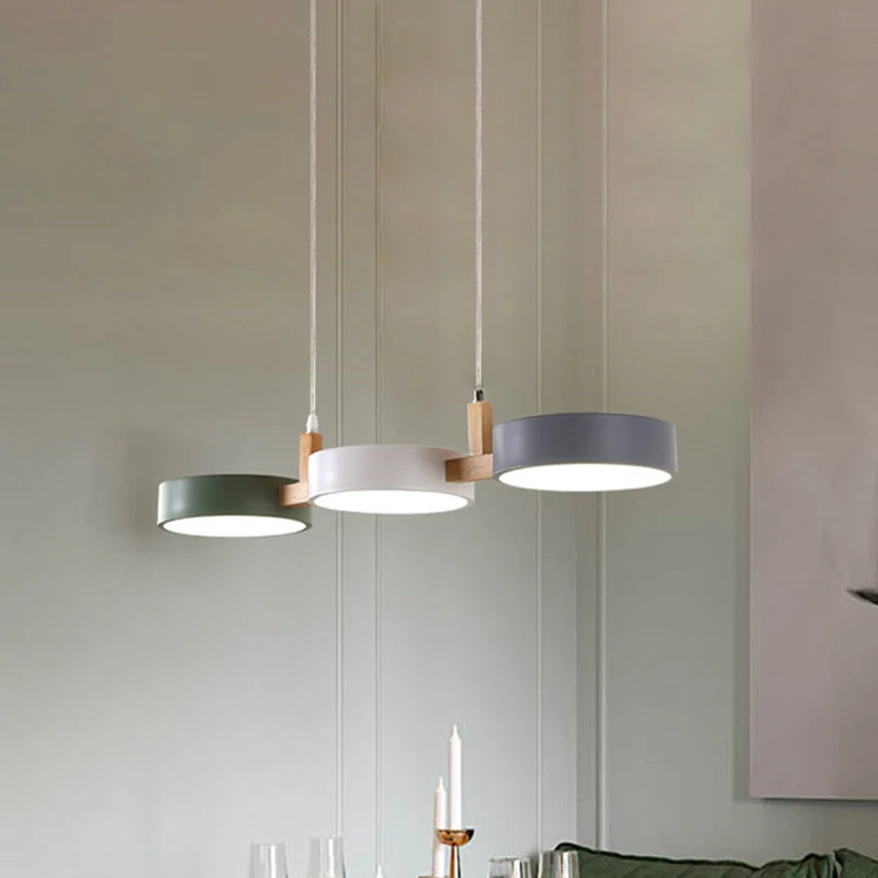 Moderne Houten Arm Hanglamp met Meerkleurige Cilinders: Breng een stijlvolle en eigentijdse sfeer in uw interieur met deze unieke hanglamp. De combinatie van metalen cilinders in witte, grijze en groene kleuren met een houten arm maakt deze lamp een opvallend en modern statement in elke kamer.