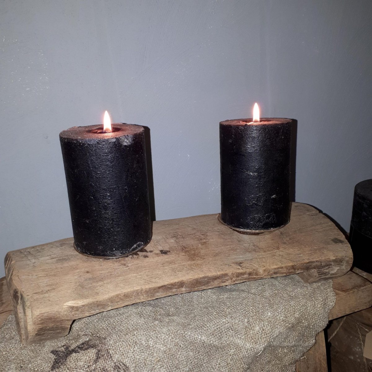 Sober houten bajotje, voorzien van 2 ijzeren kaarsenhouders.