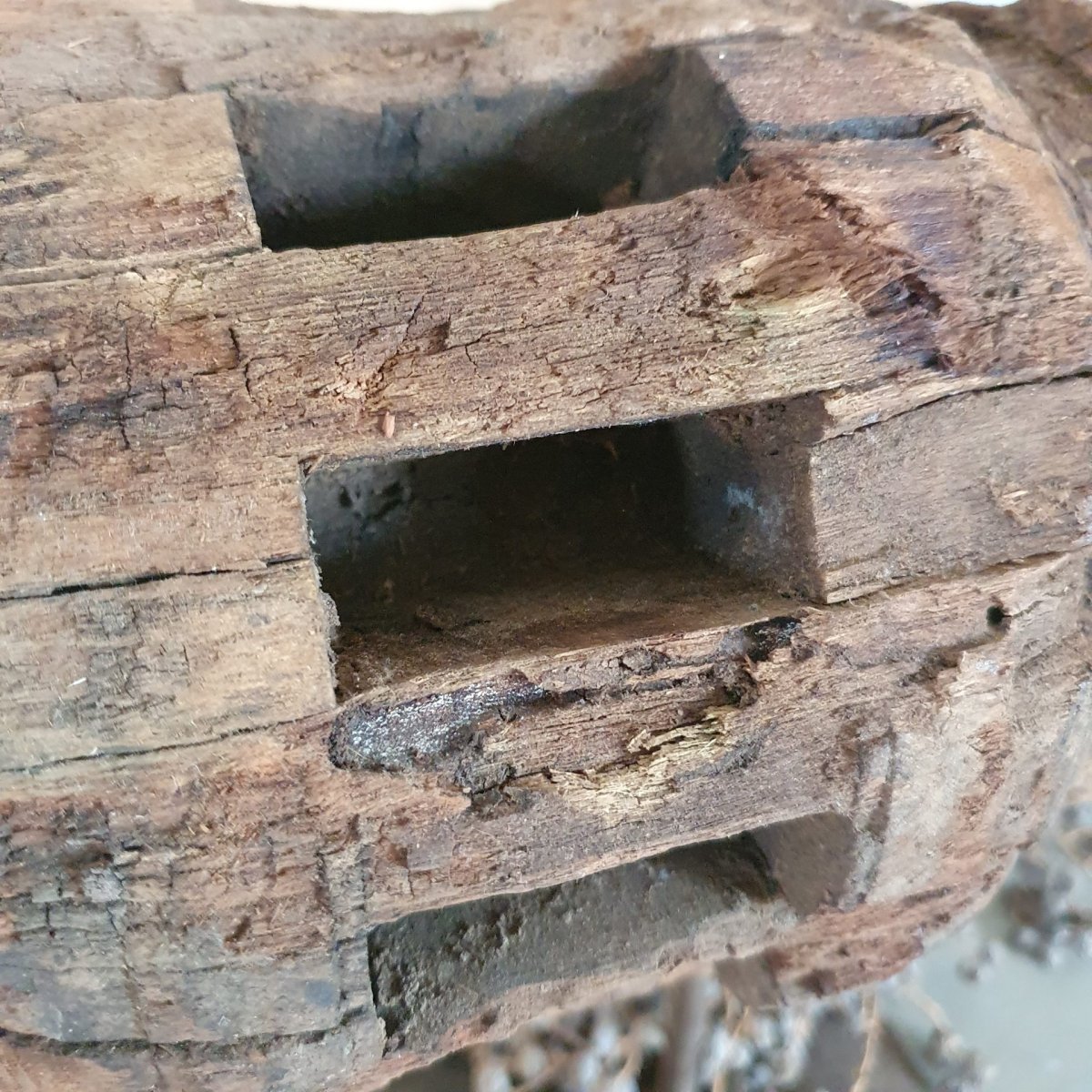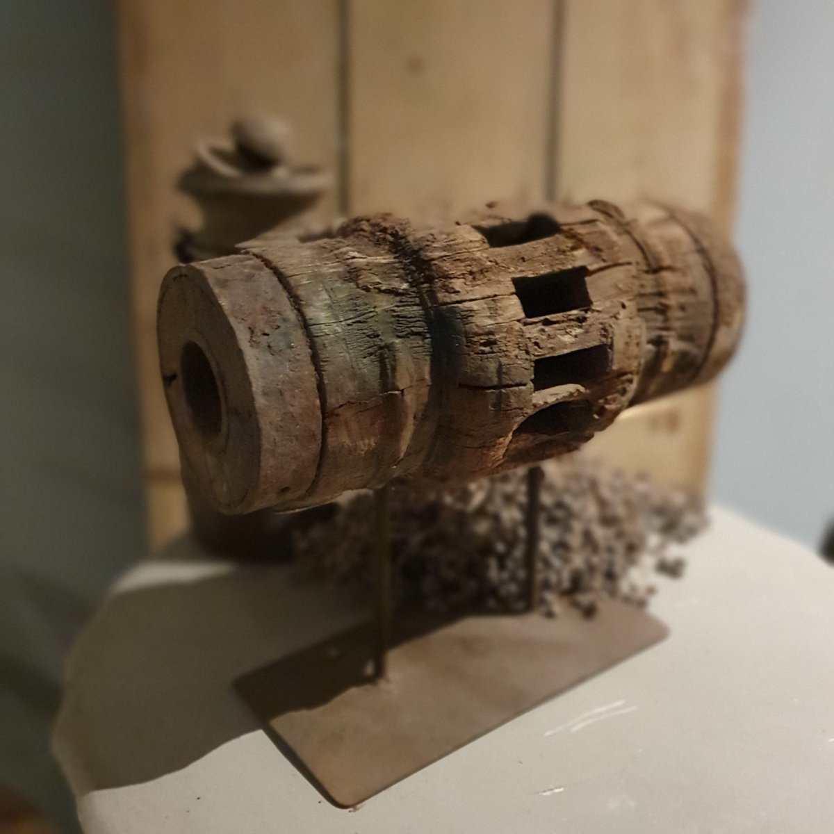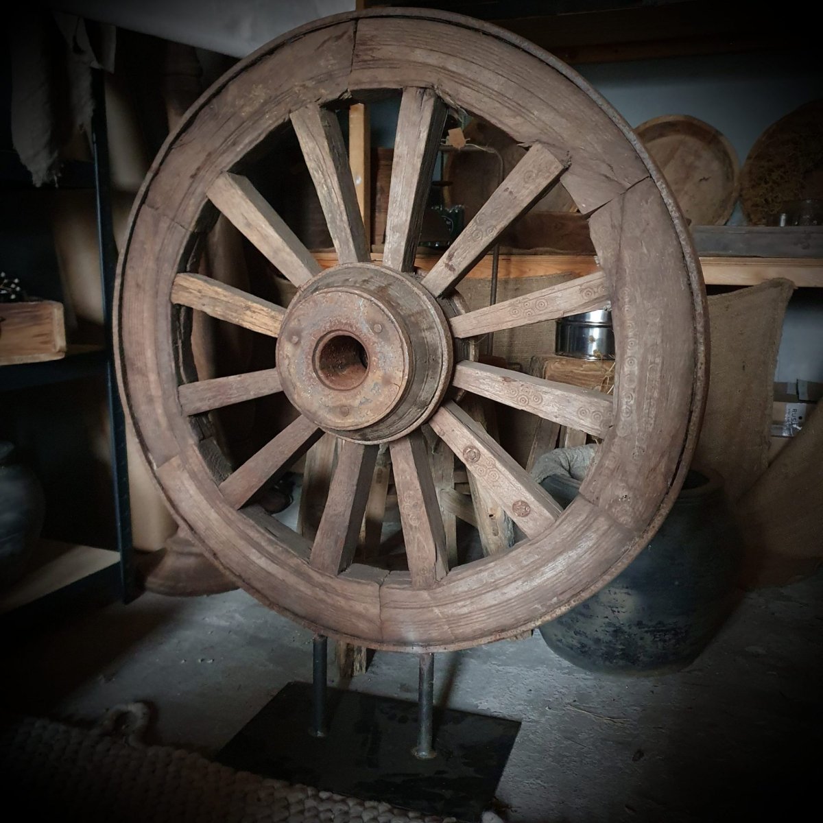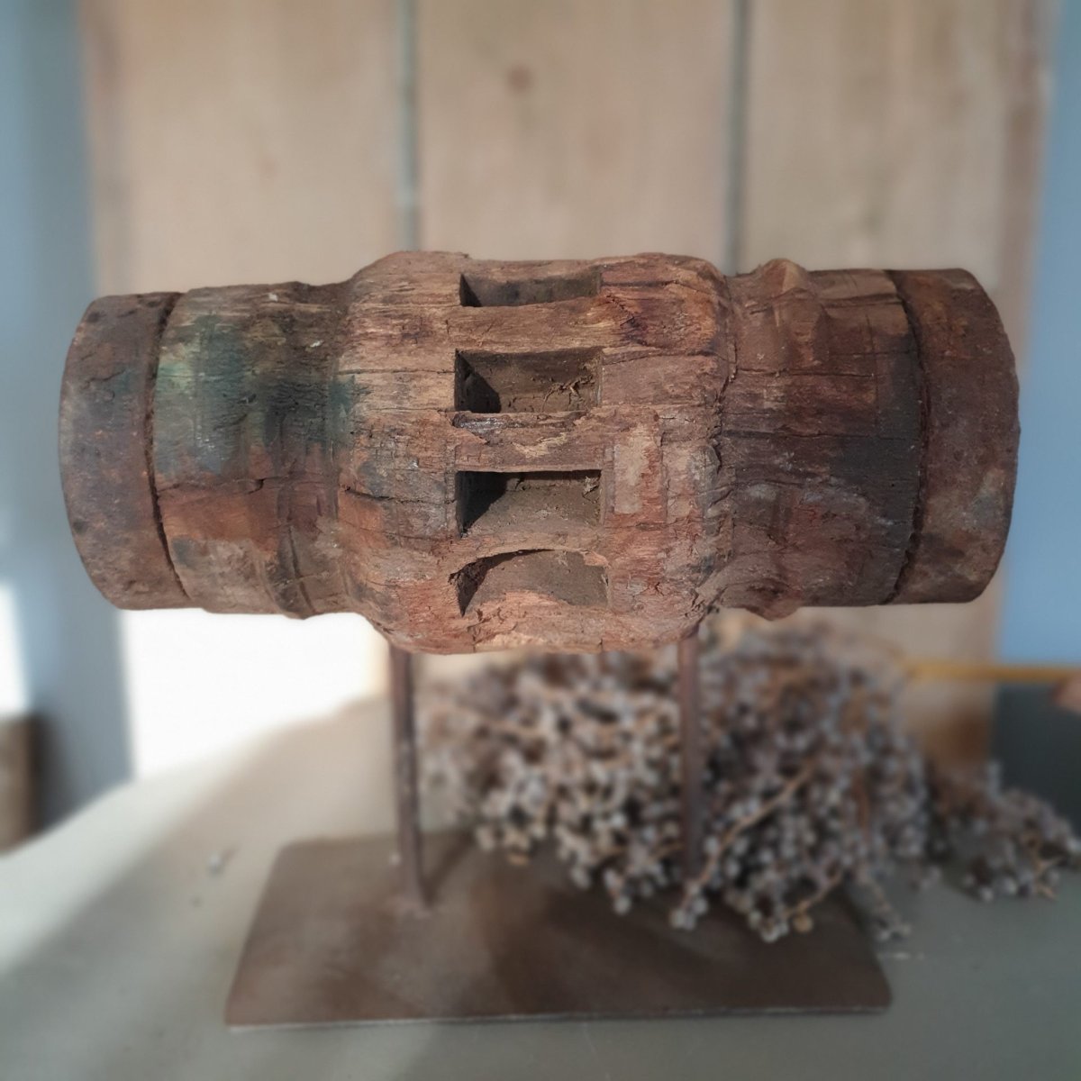 Een prachtig item, deze stoere wielnaaf of wielas van een oud wagenwiel. Met unieke kenmerken zoals het doorleefde, géleefde uiterlijk, zoals bijv. de wat donkerder, groenachtige ‘weer’plek, prachtig!