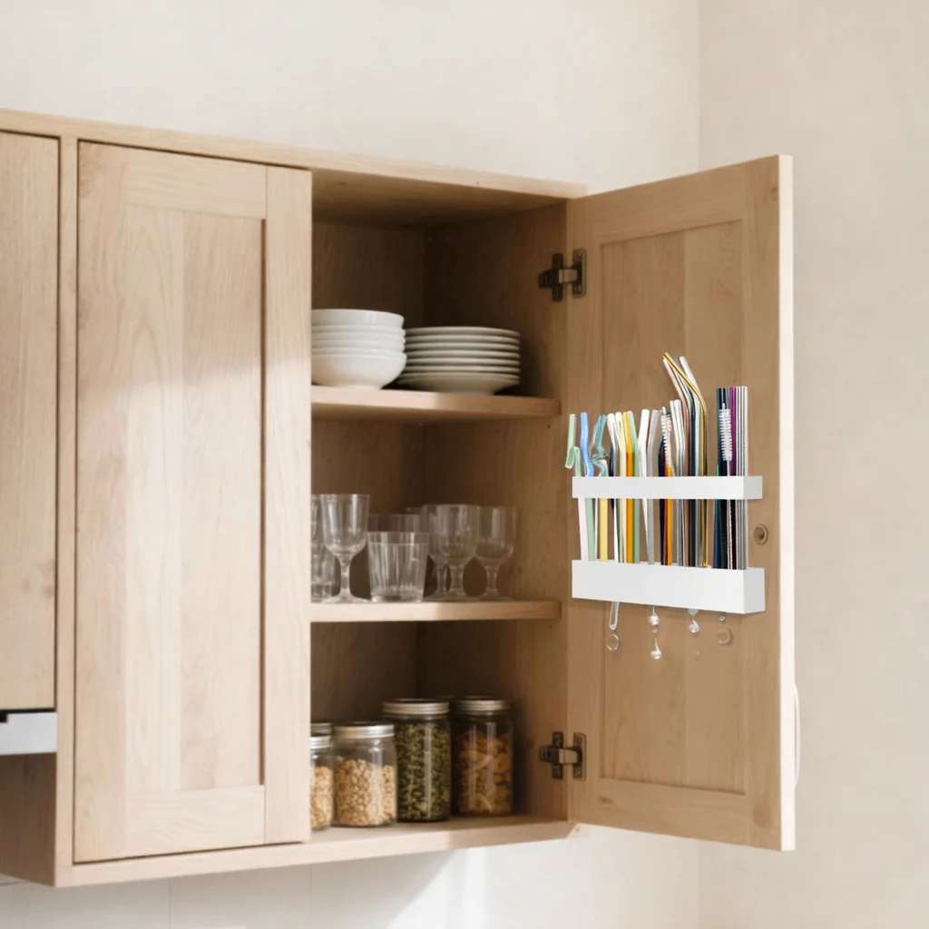 Breng meer orde in je keuken met deze rietjeshouder en organizer keuken voor gebruik aan de keukenkast deur. Dit opbergrek helpt bij het opbergen van rietjes, roerstaafjes, lepels en ander klein keukengerei. Dankzij het slimme ontwerp, de verstelbare indeling en de handige afvoeropeningen blijft alles overzichtelijk, droog en makkelijk bereikbaar tijdens dagelijks gebruik.