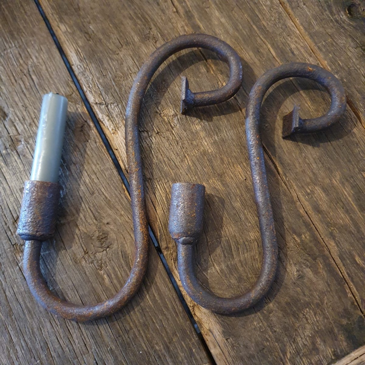 Prachtige handgesmede S-kandelaar of glashaak van zeer zware luxueze kwaliteit in een ‘roestige’ uitvoering
