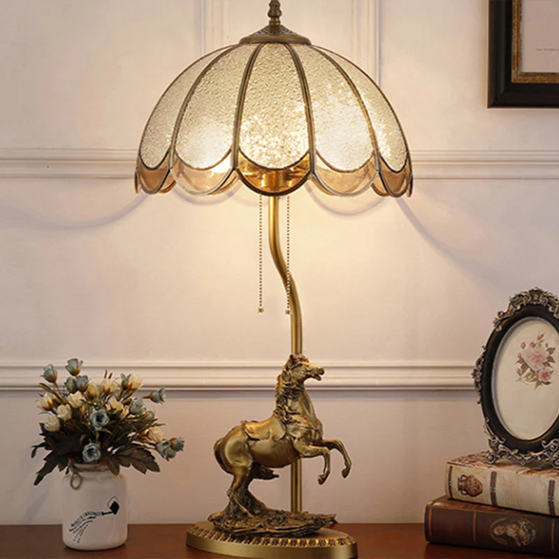 Voeg een vleugje klassieke elegantie toe aan je interieur met dit prachtige messing tafellicht. Uitgerust met twee lichten en een prachtig getint glas, is deze lamp de perfecte keuze voor elke traditionele of vintage geïnspireerde ruimte. De unieke paardendecoratie en de praktische trekketting maken dit tafellicht niet alleen stijlvol, maar ook functioneel.