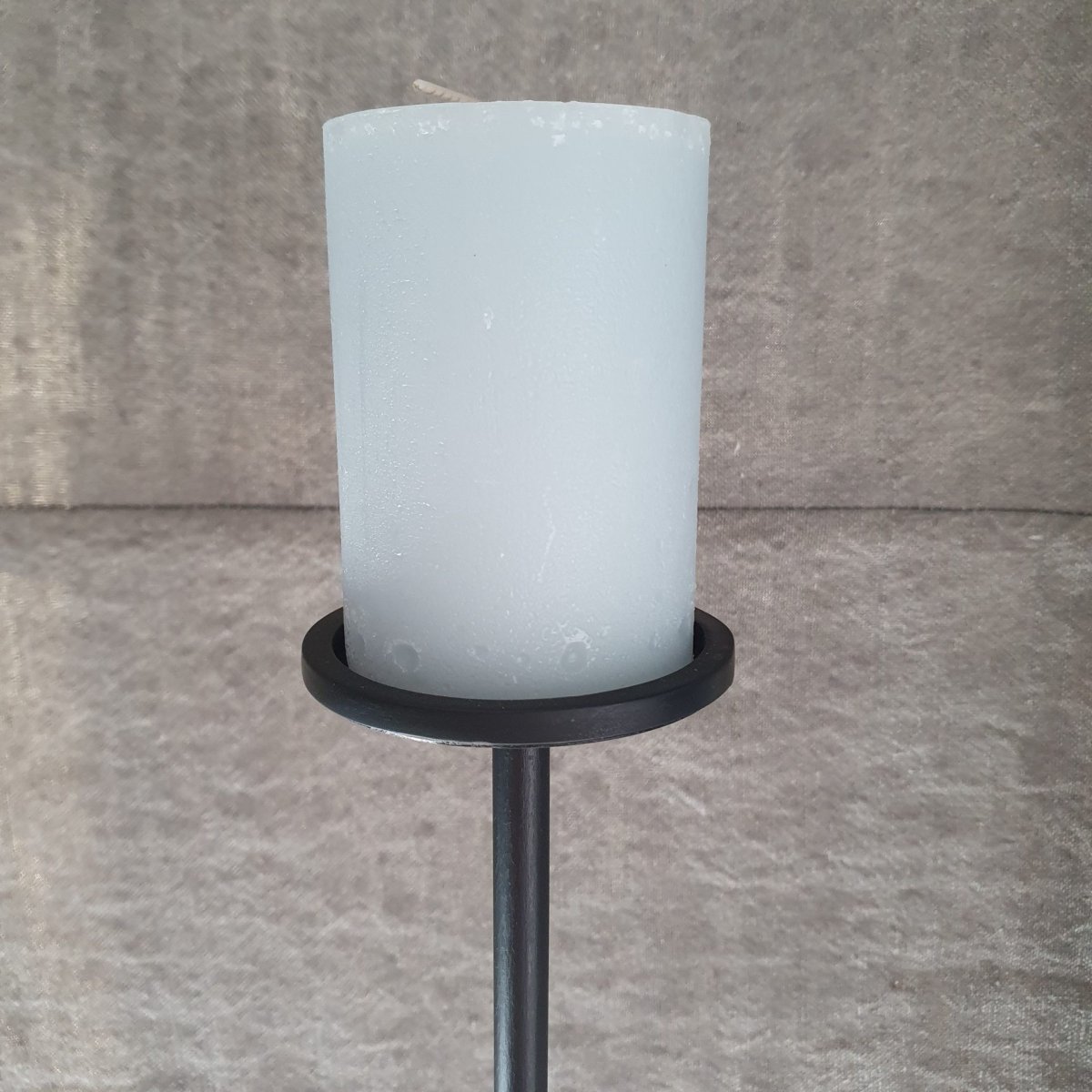 Deze zware, ijzeren kandelaar heeft een vierkante voet van 12 cm x 12 cm.