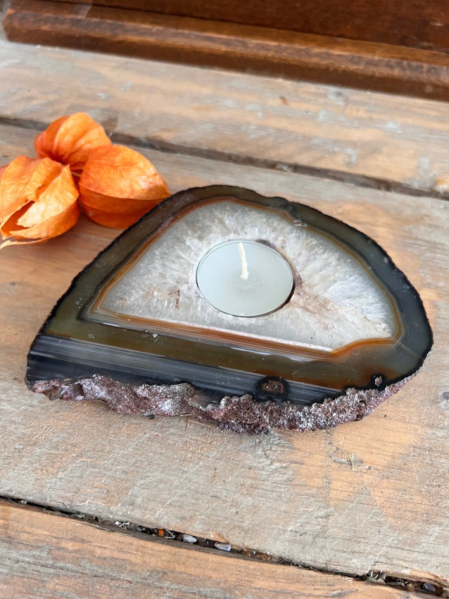 Deze preloved waxinelichthouder van agaat voegt een natuurlijke en warme aardse sfeer toe aan elke ruimte. De unieke natuurlijke patronen en kleuren maken tot een uniek exemplaar