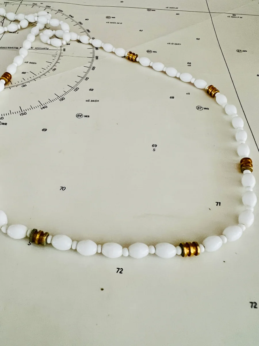 Voeg elegante vintage charme toe aan je outfit met deze prachtige witte ketting met goudkleurige accenten. De ketting is vervaardigd uit glanzende witte glaskralen die samen een tijdloos en verfijnd geheel vormen. De subtiele goudkleurige details geven de ketting een warme uitstraling en maken het een veelzijdig accessoire, perfect voor zowel casual als feestelijke gelegenheden.