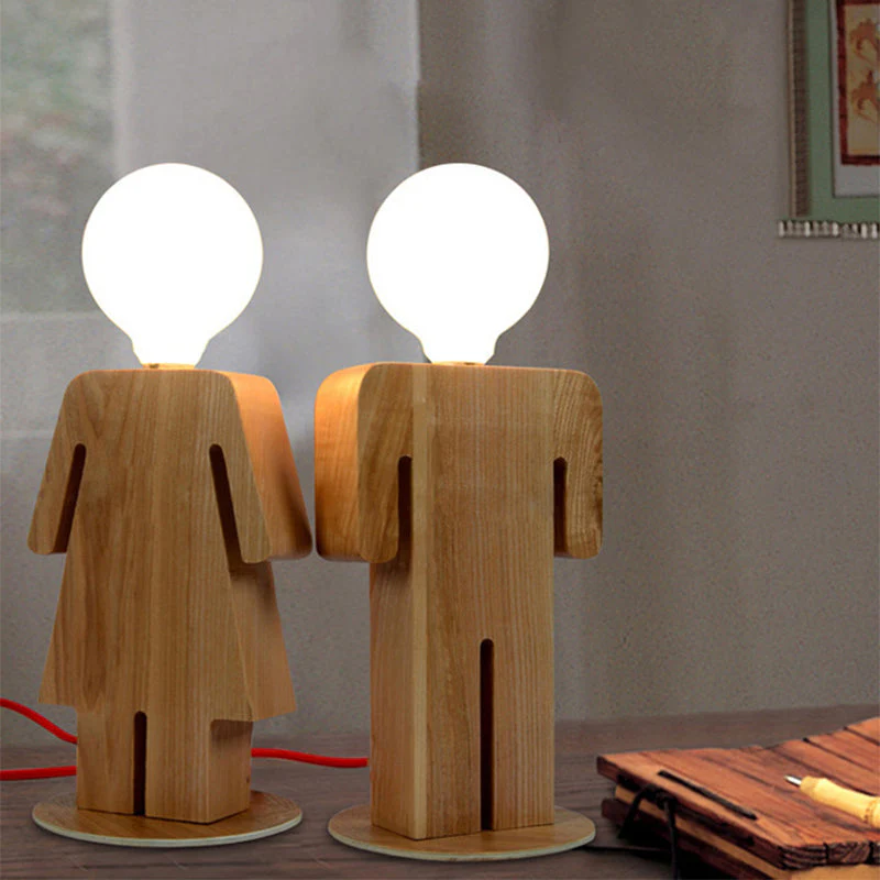 - Jongen: Houten lamp in de vorm van een jongen, naturel houtkleur.