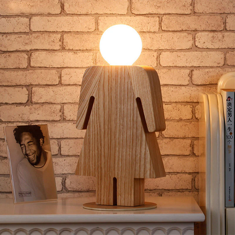 - Meisje: Houten lamp in de vorm van een meisje, naturel houtkleur.