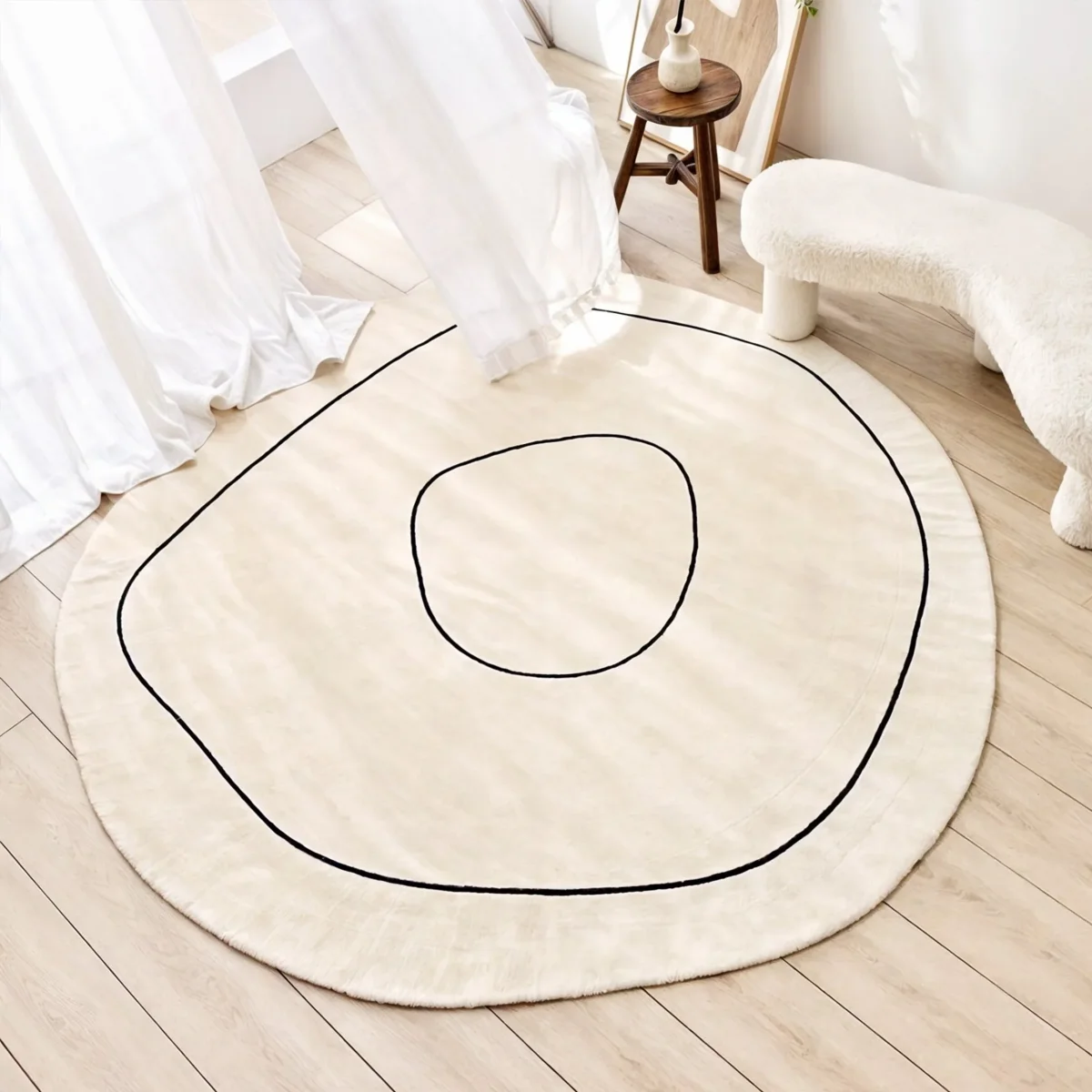 Hayle Rug: Rond wollen tapijt met onregelmatige vorm en minimalistische stijl