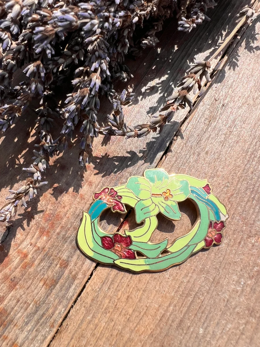 Het goudkleurige metalen frame vormt een mooi contrast met de groene emaille en accentueert de Art Nouveau esthetiek. De broche heeft een klassieke veiligheidsspeld aan de achterkant, waardoor deze gemakkelijk op kleding kan worden bevestigd.