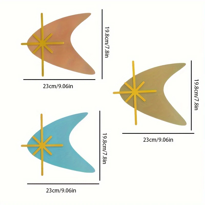Breng een vleugje vintage elegantie in je woonkamer met deze 3-delige set Art Deco Metalen Muursculpturen. Het geometrische boemerangontwerp en het abstracte thema creëren een opvallende visuele impact, perfect voor Thanksgiving en andere feestelijke gelegenheden. Gemaakt van hoogwaardig metaal en ontworpen als reproductie, voegen deze sculpturen een verfijnd en stijlvol accent toe aan je interieur.
