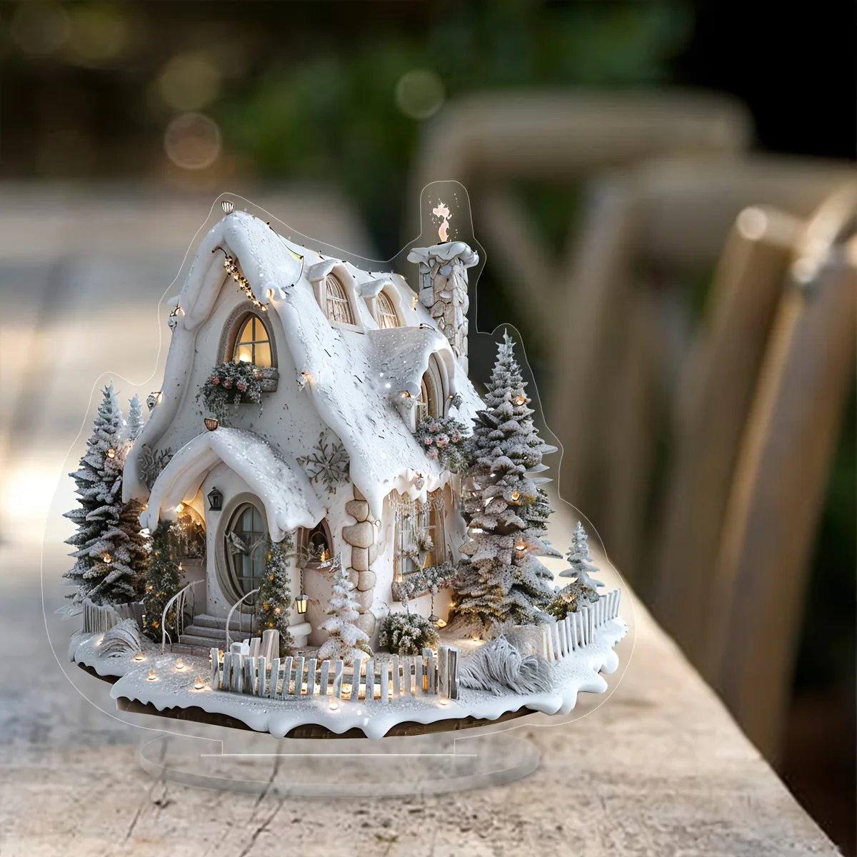 Deze prachtige acryl tafeldecoratie brengt het gevoel van een besneeuwd kerstdorp naar elke ruimte. Met een shabby chic uitstraling en subtiele details is dit stuk ideaal voor thuis of op kantoor, op bureaus, planken en tafels. Voeg een vleugje nostalgie en feestelijkheid toe aan je interieur, een perfect geschenk voor vrienden en familie tijdens de feestdagen.
