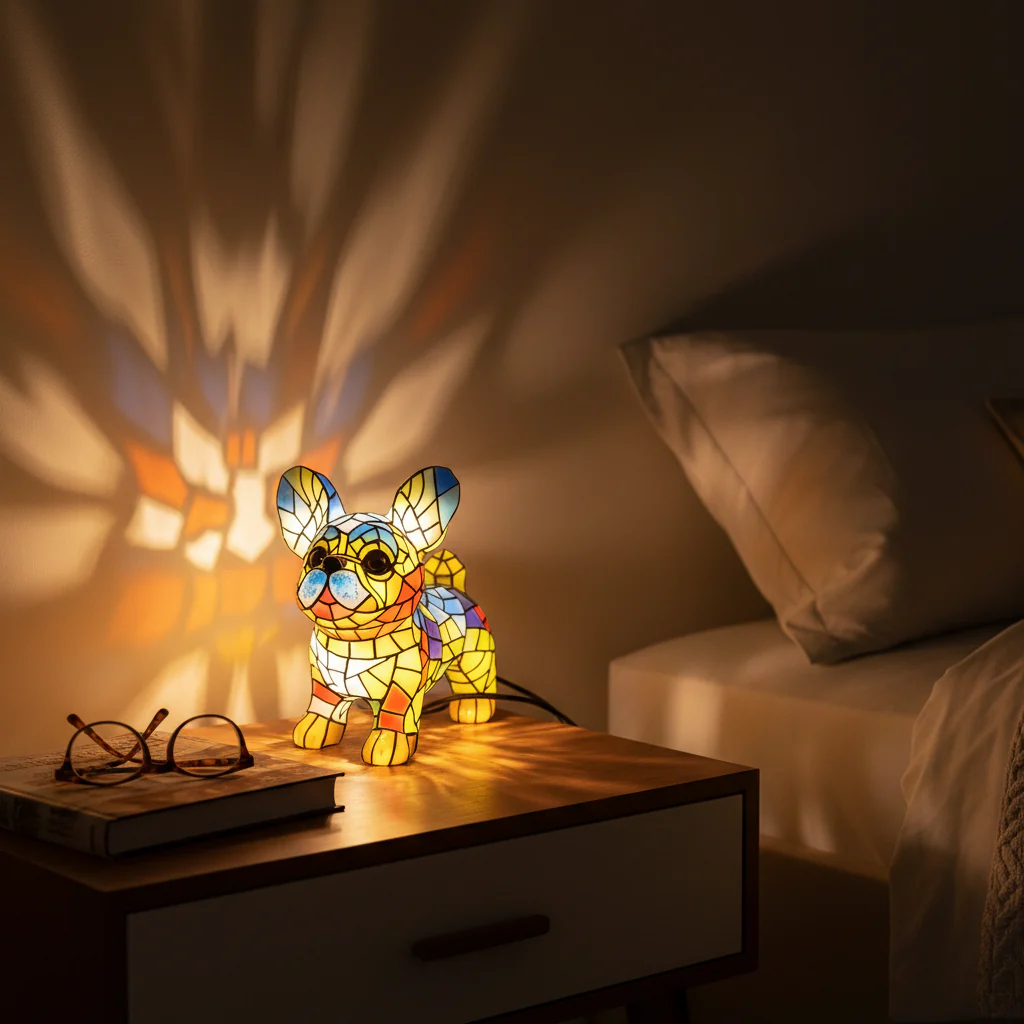Breng karakter en charme in uw interieur met de unieke Franse Bulldog lamp. Dit artistieke hondenfiguur combineert visuele aantrekkingskracht en sfeervolle verlichting. Het geometrische ontwerp, gemaakt van gebrandschilderd hars, voegt een moderne en stijlvolle uitstraling toe aan elke kamer. Deze lamp is niet alleen een decoratief accent, maar ook een functioneel lichtpunt voor uw huis.
