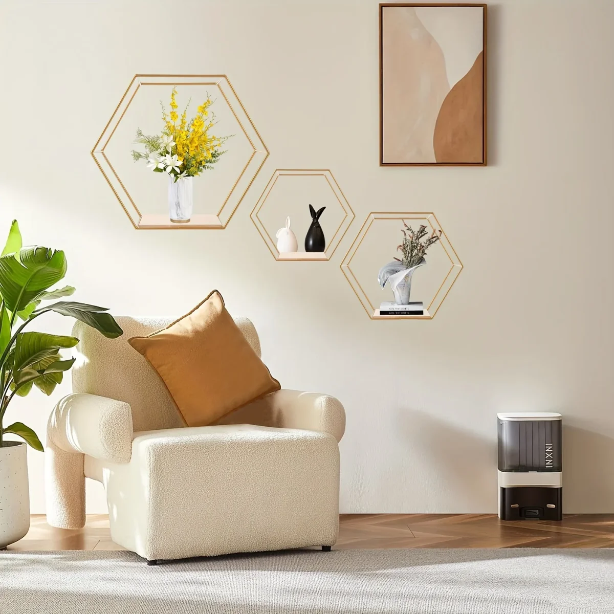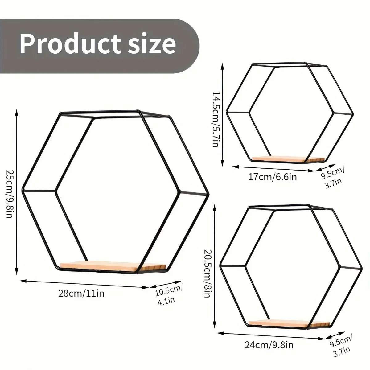 De HexaDisplay – Set van 3 Zeshoekige Zwevende Planken is perfect voor het creëren van een stijlvolle en georganiseerde ruimte. Deze metalen wandgemonteerde planken met een massief houten basis combineren een vintage uitstraling met een modern design. Ideaal voor het decoreren van slaapkamers, woonkamers, keukens of kantoren, en voor het tentoonstellen van familie-items zonder elektriciteit te gebruiken. Deze planken voegen niet alleen functionaliteit toe, maar ook een prachtige vintage sfeer aan elke kamer.
