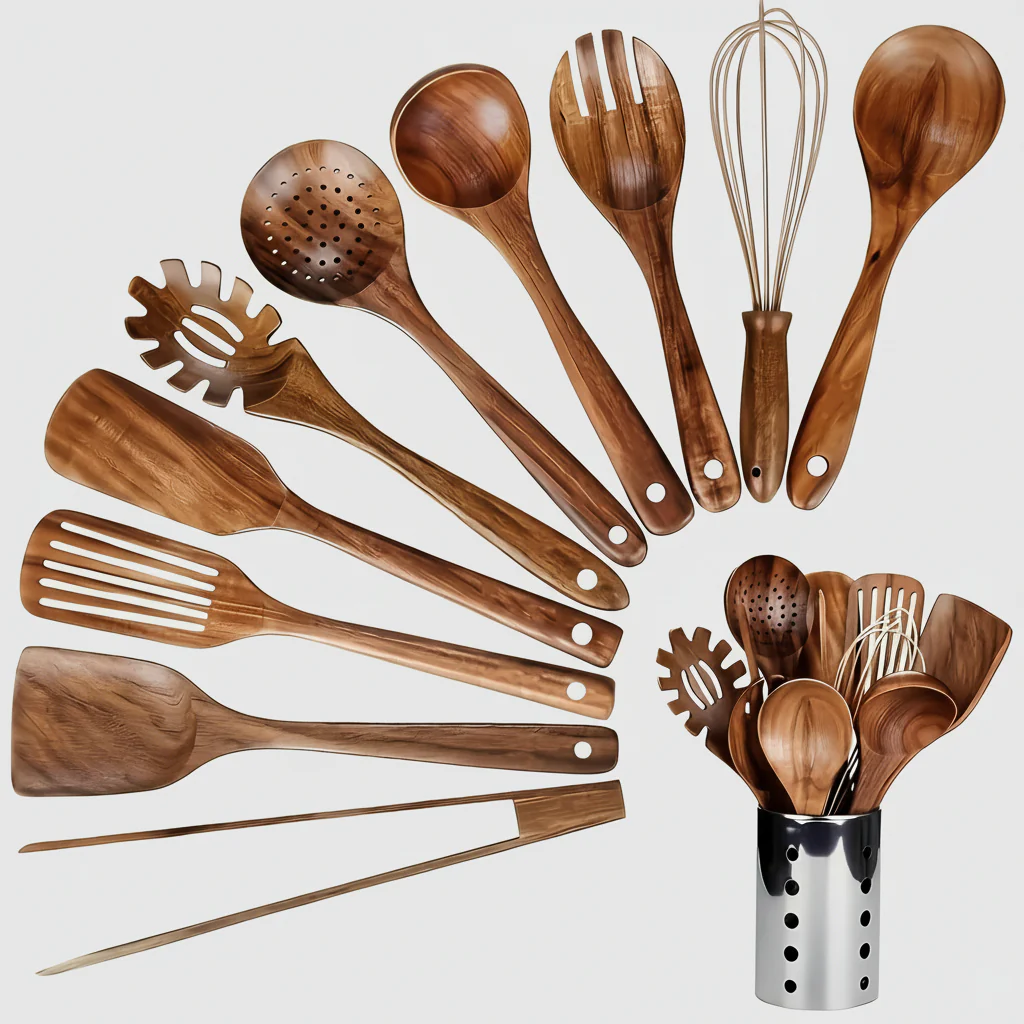 Maak elke maaltijd makkelijker met deze siliconen keukengerei set, ontworpen voor dagelijks koken zonder krassen op je pannen. De voedselveilige siliconen koppen zijn hittebestendig tot 230°C en helpen je roeren, scheppen en serveren zonder gedoe. Dankzij de houten handvatten ligt elk item prettig in de hand. Deze complete keukengerei set past perfect in elke keuken.