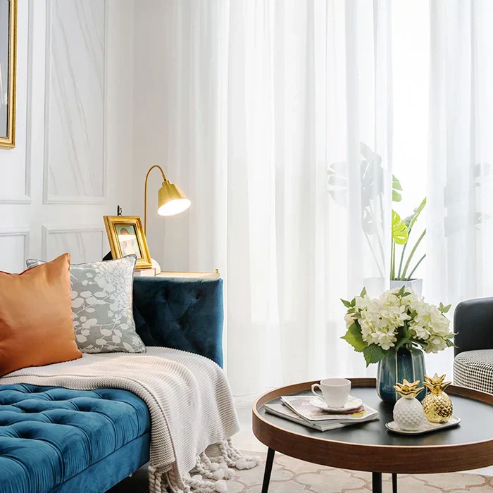 De Kira Wit Katoenmix Transparante Tulle Gordijnen combineren een zachte katoentextuur met de duurzaamheid van polyester. Deze gordijnen zijn ontworpen om privacy te bieden terwijl ze het natuurlijke licht subtiel filteren, wat zorgt voor een luchtige en uitnodigende sfeer in uw huis.