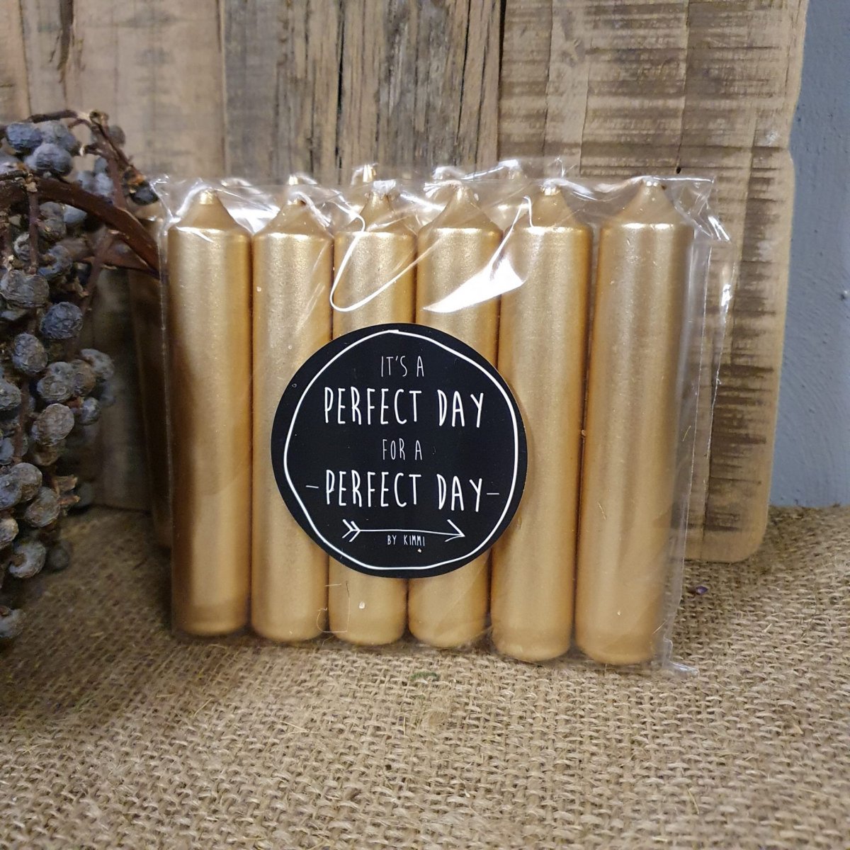 Stoere goudkleurige dinerkaarsjes – 12 cm lang, per 6 st. verpakt in een leuk zakje!