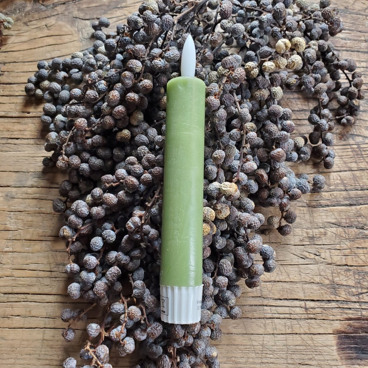 Het olijfgroene kaarsje ziet er bijna uit als een ‘echt’ kaarsje, enkel het vlammetje is van plastic maar zodra dat brandt zie je bijna geen verschil meer!