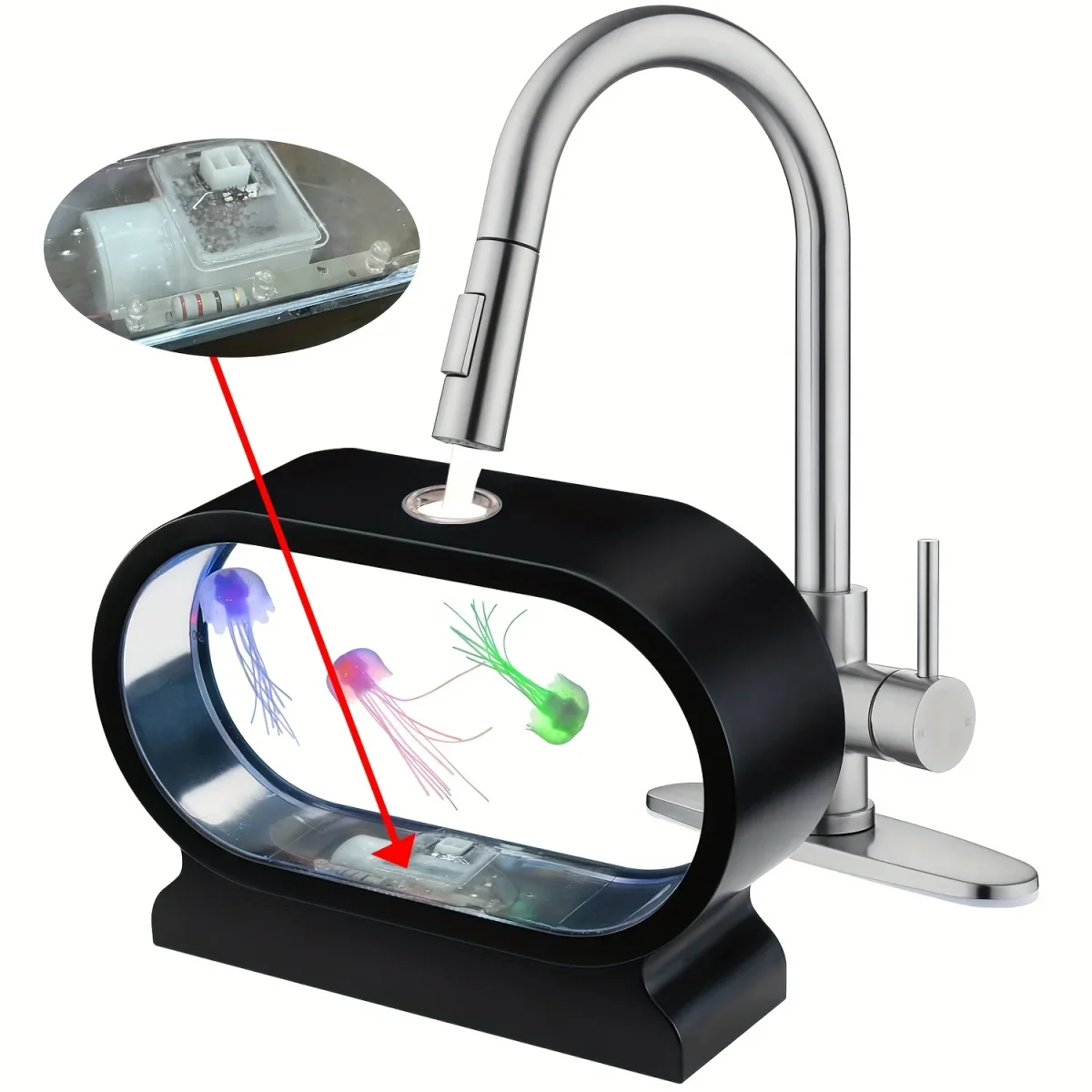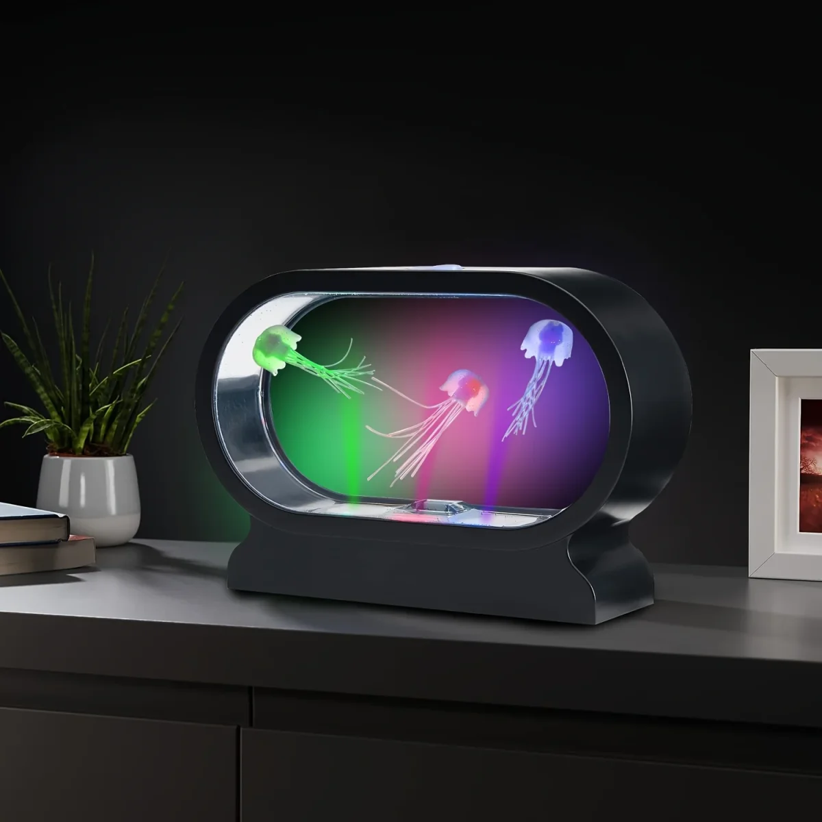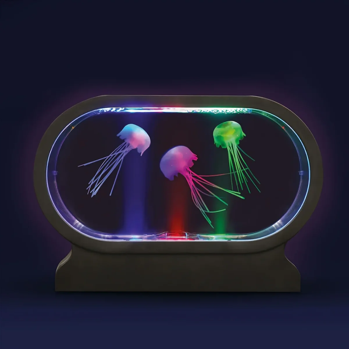 De LumiJelly tafellamp brengt de serene bewegingen van kwallen tot leven in een prachtig verlicht aquarium. Dit unieke decoratieve licht biedt een betoverend schouwspel en is ideaal voor slaapkamers, woonkamers en kantoren. Met 3 verschillende kleuren biedt deze lamp een rustgevende ambiance, perfect voor ontspanning of als eyecatcher op feestjes. De lamp werkt op batterijen, waardoor hij gemakkelijk overal geplaatst kan worden.
