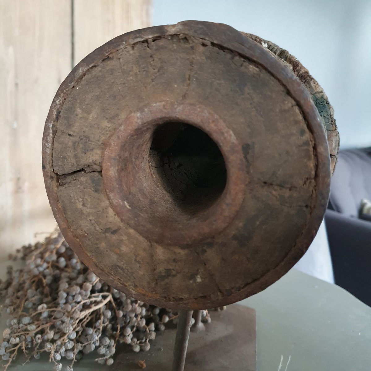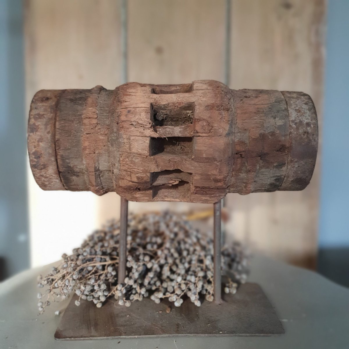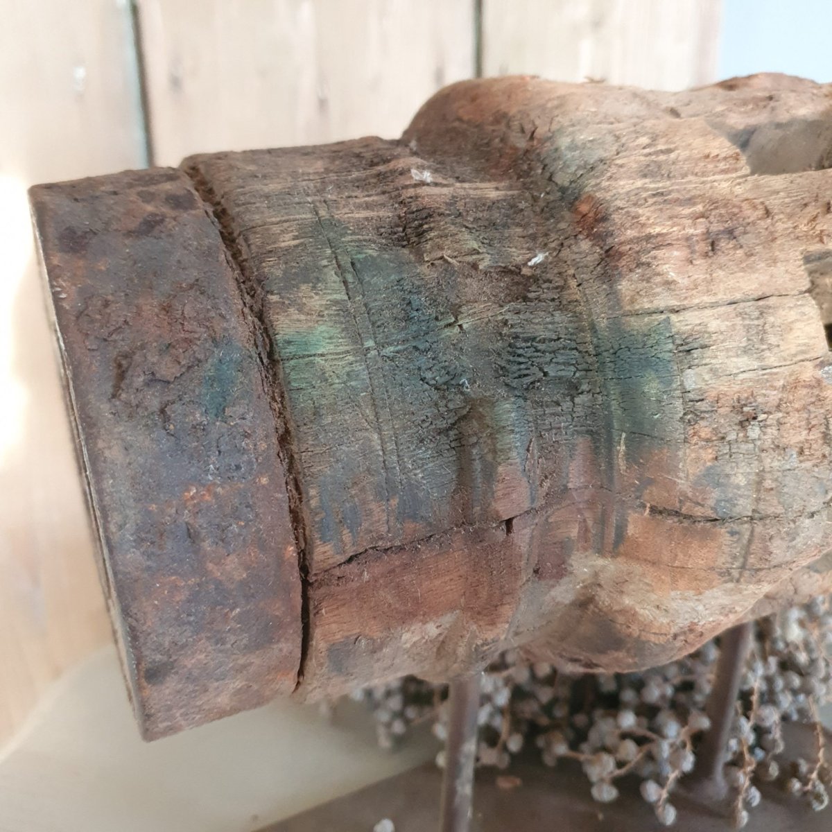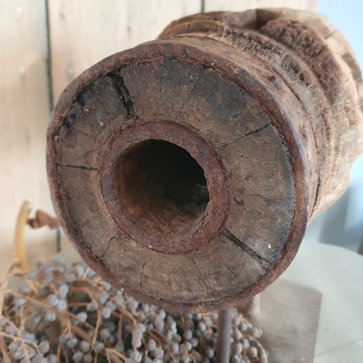 Een prachtig item, deze stoere wielnaaf of wielas van een oud wagenwiel. Met unieke kenmerken zoals het doorleefde, géleefde uiterlijk, zoals bijv. de wat donkerder, groenachtige ‘weer’plek, prachtig!
