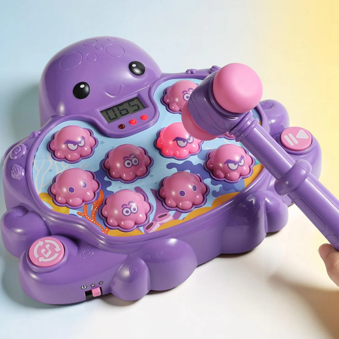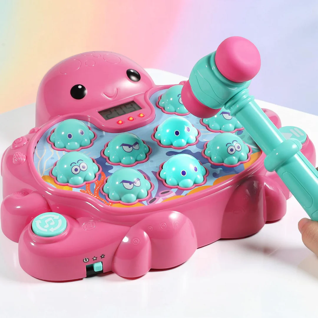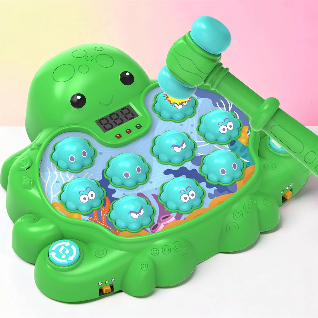 Laat kinderen actief spelen met dit vrolijke speelgoed hamer spel in een leuke octopus vorm. Dit interactieve reactiespel helpt bij het ontwikkelen van hand oog coördinatie terwijl kinderen plezier hebben tijdens het slaan op de bewegende figuren. Het kleurrijke interactief speelgoed maakt spelen leuk voor thuis, kinderfeestjes en schoolactiviteiten.