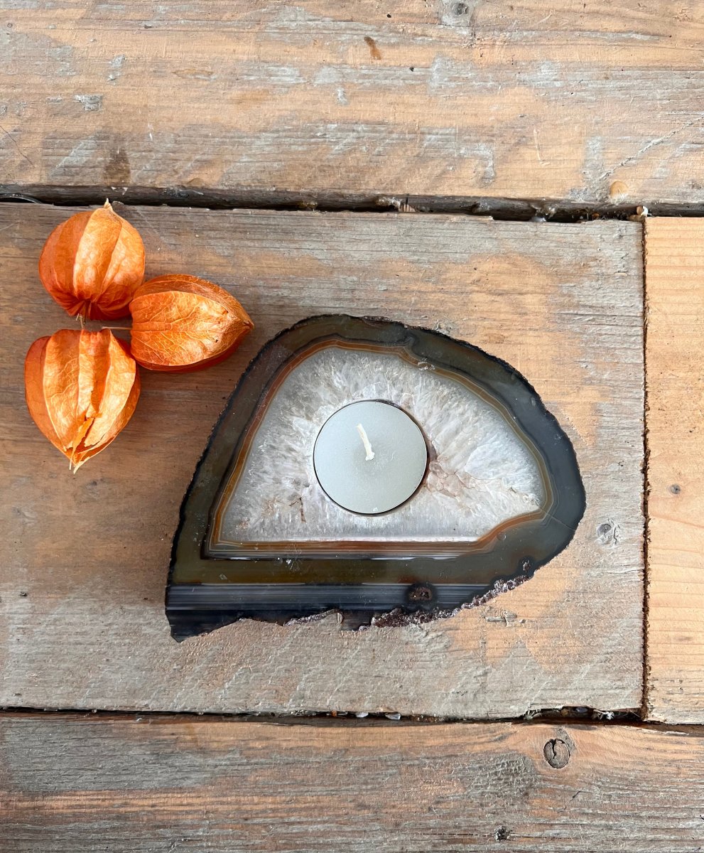 Deze preloved waxinelichthouder van agaat voegt een natuurlijke en warme aardse sfeer toe aan elke ruimte. De unieke natuurlijke patronen en kleuren maken tot een uniek exemplaar