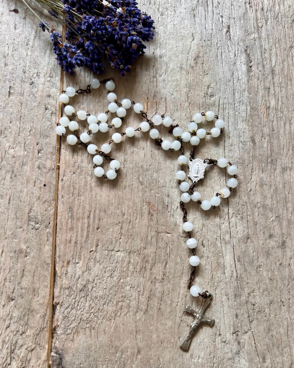 Deze prachtige vintage rozenkrans is gemaakt van witte glaskralen. De rozenkrans heeft een elegant en tijdloos design, perfect voor liefhebbers van vintage en religieuze accessoires.