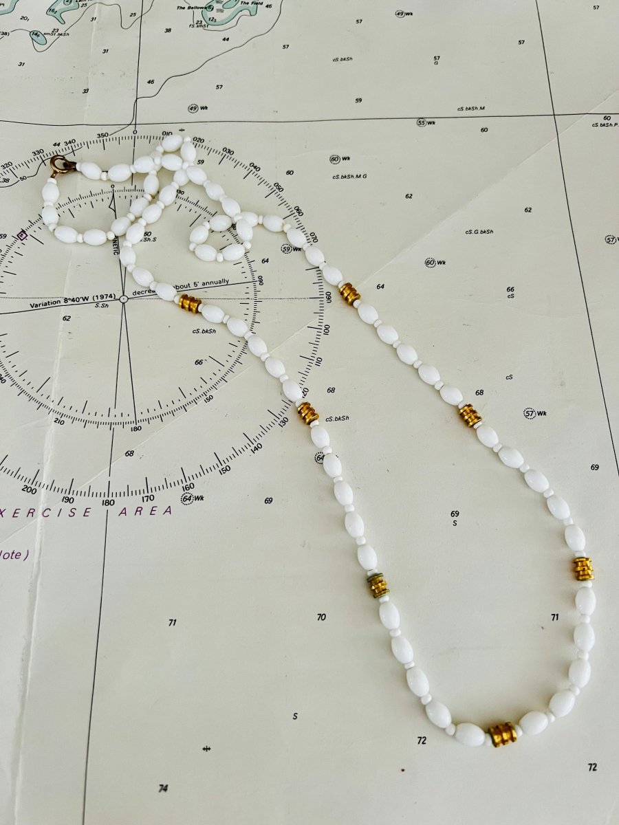 Voeg elegante vintage charme toe aan je outfit met deze prachtige witte ketting met goudkleurige accenten. De ketting is vervaardigd uit glanzende witte glaskralen die samen een tijdloos en verfijnd geheel vormen. De subtiele goudkleurige details geven de ketting een warme uitstraling en maken het een veelzijdig accessoire, perfect voor zowel casual als feestelijke gelegenheden.
