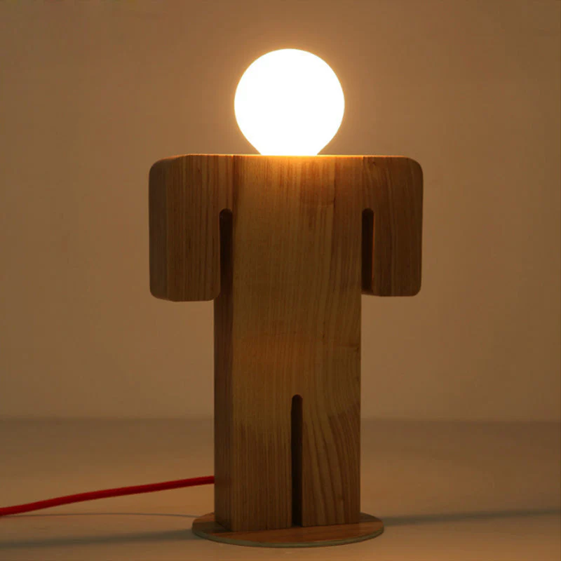 - Jongen: Houten lamp in de vorm van een jongen, naturel houtkleur.