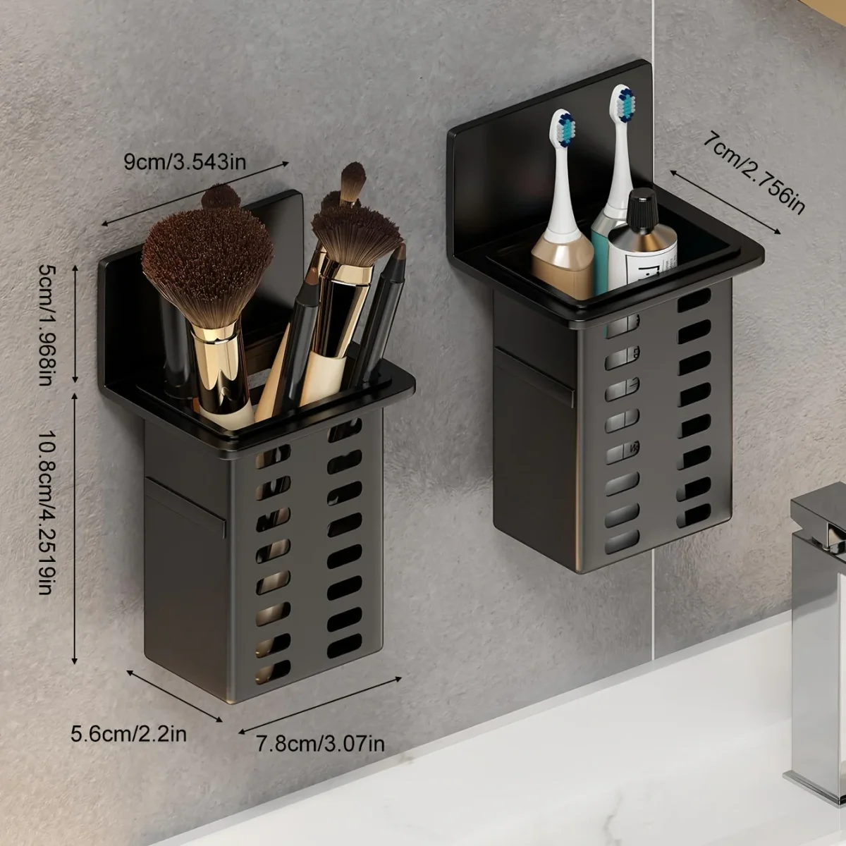 Het Zwart Cosmetisch Rek is een praktische oplossing voor het opbergen van je cosmetica of keukenaccessoires zonder dat je hoeft te boren. Dankzij het boorvrije ontwerp blijft je muur onbeschadigd en geniet je van een opgeruimde omgeving. Het rek is eenvoudig te monteren en heeft een drainagefunctie om vochtophoping te voorkomen.
